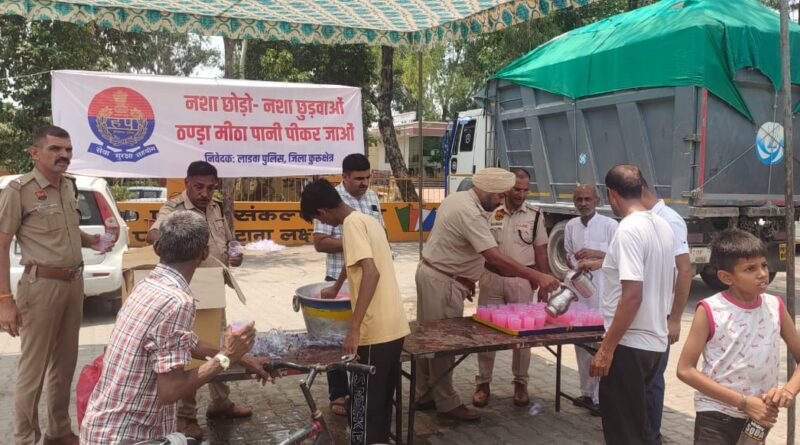 text-align: center; पुलिस प्रवक्ता ने बताया कि अभियान के तहत जिला पुलिस की विभिन्न टीमें अलग-अलग जगहों पर विभिन्न प्रकार के आयोजन कर नशामुक्ति का सन्देश दे रहीं हैं। दिनांक 14 जून को थाना लाडवा प्रभारी निरीक्षक सुनील वत्स के मार्ग-दर्शन में पुलिस टीम ने थाना एरिया में ठन्डे पानी की छ्ब्बील लगाकर आमजन को ठन्डा पानी पिलाकर नशे से दूर रहने का सन्देश दिया।